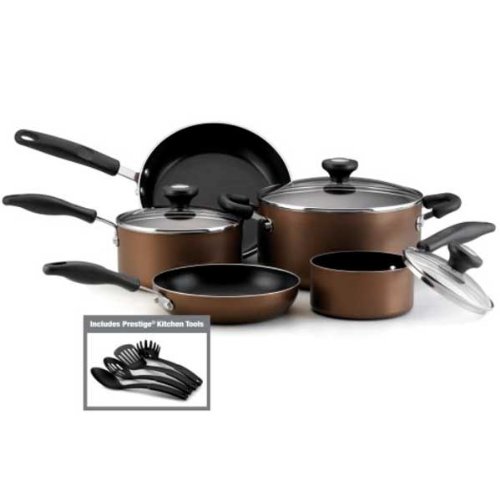 An economical way to equip your kitchen with the cookware basics, including kitchen tools. Beautiful and functional, each pan has a nonstick interior for easy cleanup. Tempered glass lids offer a snug fit keeping moisture and nutrients in the pan. The durable aluminum construction ensures even heating.Set includes:1-qt. Covered Sauce Pan2-qt. Covered Sauce Pan5-qt. Covered Dutch Oven8-in. Deep Skillet10-in. Deep SkilletFour Prestige Kitchen Tools: Solid Spoon, Slotted Spoon, Slotted Turner, Pasta ForkFeatures:A superior nonstick interior provides for fat free cooking and effortless clean up. Dishwasher safe.Even heat distribution throughout the entire pan for perfect cooking performance.Glass lids let you monitor cooking progress without releasing moisture or nutrients.Comfortable, riveted handles are secure and oven safe to 350??F.